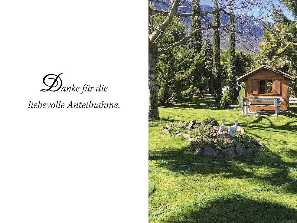 Unser besonderer Dank gilt dem Hausarzt Dr. Franceschini, seiner Assistentin Notburga, den Ärzten und dem Pflegepersonal der Gastro und Gynäkologie sowie Frau Dr. Gapp der Palliativmedizin des Krankenhauses Bozen für die Unterstützung.