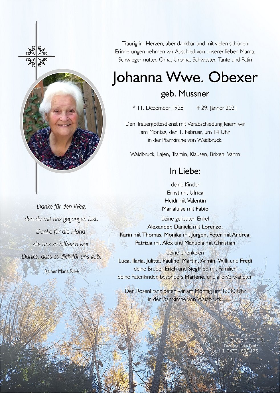Trauerfeier: 01.02. - 14:00 Uhr Waidbruck
