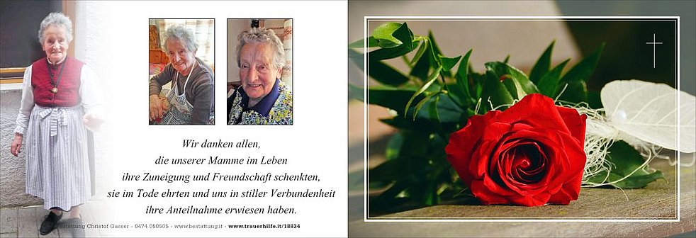 Dankbar für die lange Zeit, die wir gemeinsam erleben durften, nehmen wir traurigen Herzens Abschied von unserer lieben Mutter, Schwiegermutter und Oma, Frau
