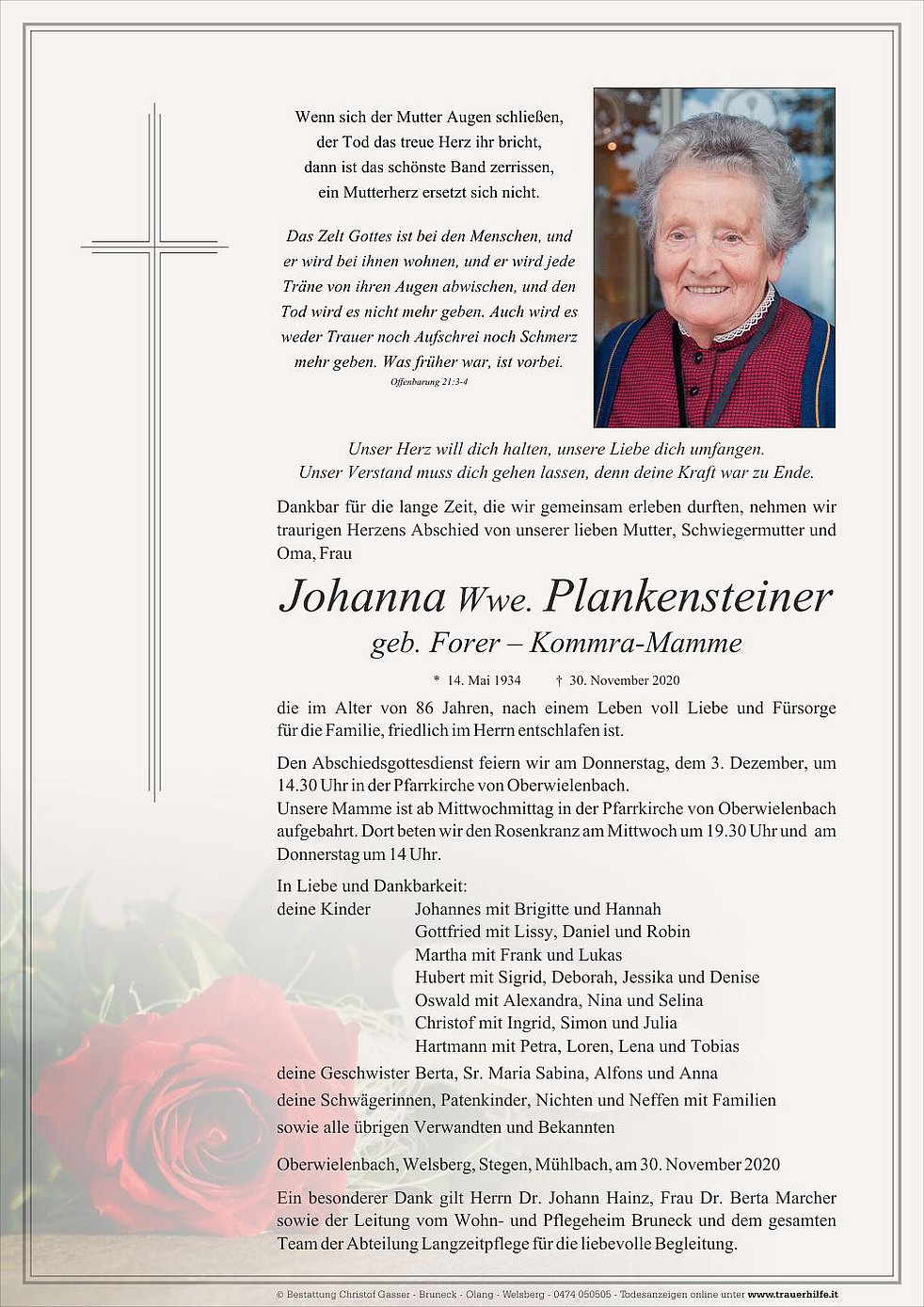 Unsere Mamme ist ab Mittwochmittag in der Pfarrkirche von Oberwielenbach aufgebahrt. Dort beten wir den Rosenkranz am Mittwoch um 19.30 Uhr und am Donnerstag um 14 Uhr.