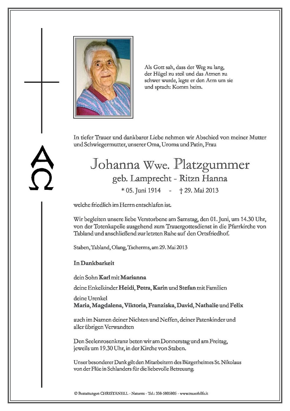 Wir begleiten unsere liebe Verstorbene am Samstag, den 01. Juni, um 14.30 Uhr, von der Totenkapelle ausgehend zum Trauergottesdienst in die Pfarrkirche von Tabland und anschließend zur letzten Ruhe auf den Ortsfriedhof.