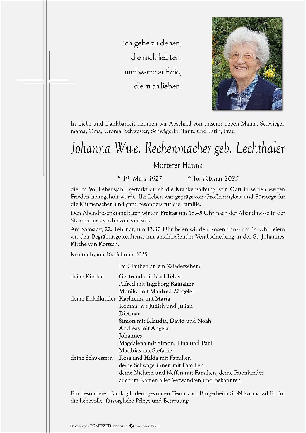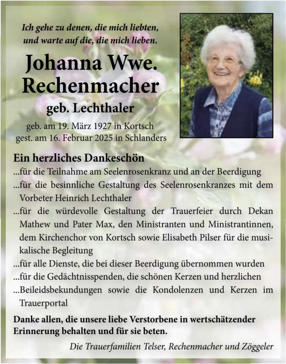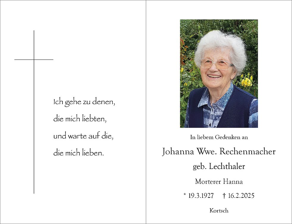 Liebe Trauerfamilie mir wärn enkre Mama olm in guater Erinnerung beholtn ,denn im Bürgerheim draussn hot sie uan olm mit ihren Lächeln asou lieb ongschaug und sie wor a sehr liabe Nochborin und iaz derf enkre Mama in Frieden ruhen!!!Mathilde und Herbert Schwemm