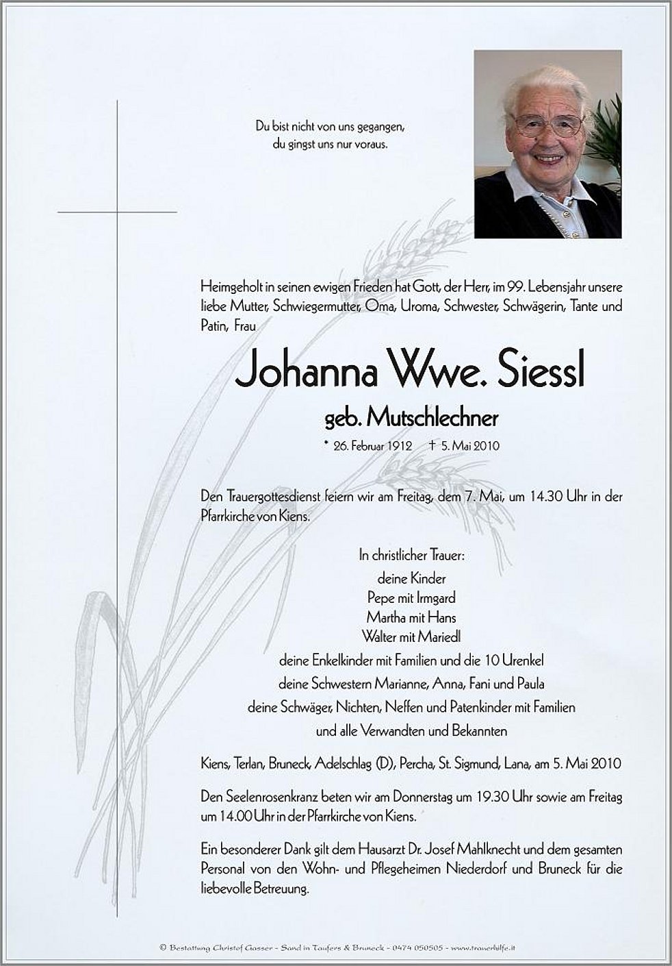 Den Trauergottesdienst feiern wir am Freitag, dem 7. Mai, um 14.30 Uhr in der Pfarrkirche von Kiens.