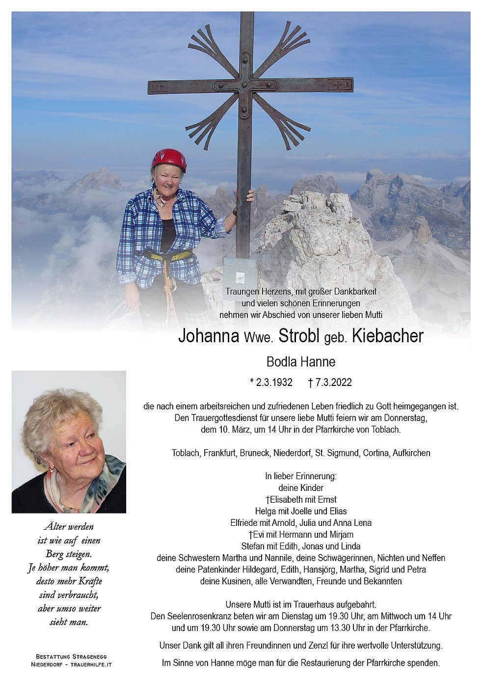Den Trauergottesdienst für unsere liebe Mutti feiern wir am Donnerstag, dem 10. März, um 14 Uhr in der Pfarrkirche von Toblach.