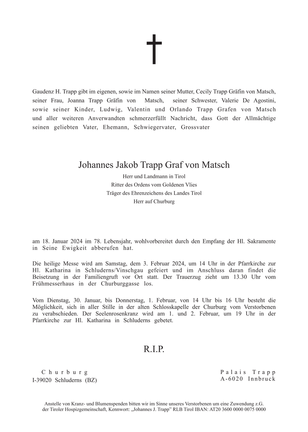 Werde Graf Johannes Trapp, als meinen ersten Arbeitsgeber auf Churburg, stets in guter Erinnerung behalten. Es war mir eine Ehre..Graf Trapp. Ruhe in Frieden