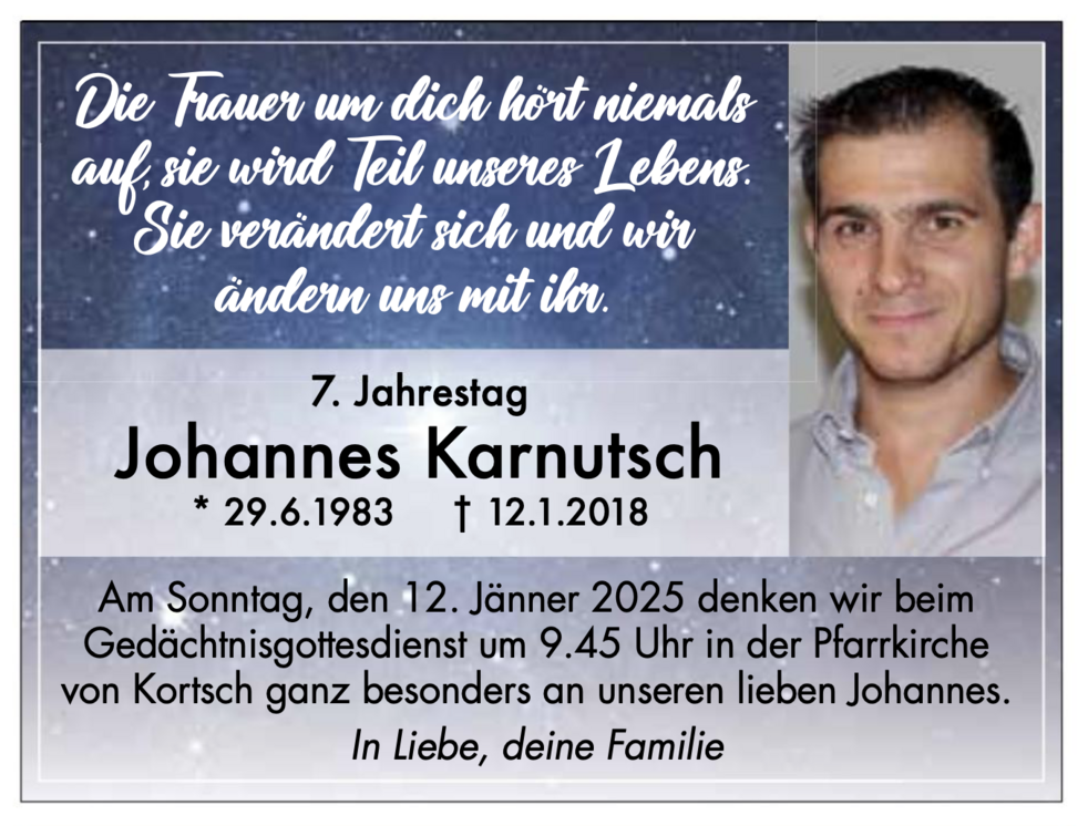 Am Dienstag, 16. Jänner, um 13.30 Uhr beten wir den Rosenkranz in der St.-Johannes-Kirche; um 14 Uhr feiern wir den Begräbnisgottesdienst, und anschließend begleiten wir unseren lieben Johannes zur letzten Ruhe auf den Ortsfriedhof von Kortsch.