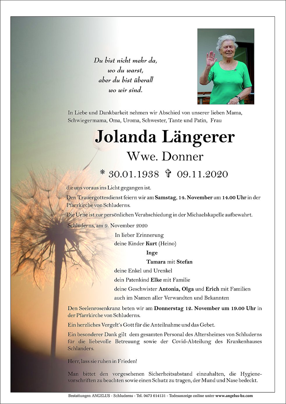 Bestattungen ANGELUS - Schluderns - Tel. 0473 614131 - Todesanzeige online unter www.angelus-bz.com