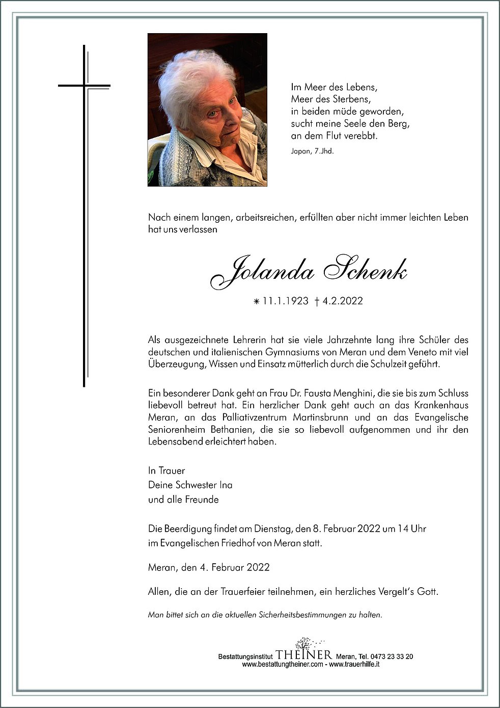 Ein besonderer Dank geht an Frau Dr. Fausta Menghini, die sie bis zum Schluss liebevoll betreut hat. Ein herzlicher Dank geht auch an das Krankenhaus Meran, an das Palliativzentrum Martinsbrunn und an das Evangelische Seniorenheim Bethanien, die sie so liebevoll aufgenommen und ihr den Lebensabend erleichtert haben.