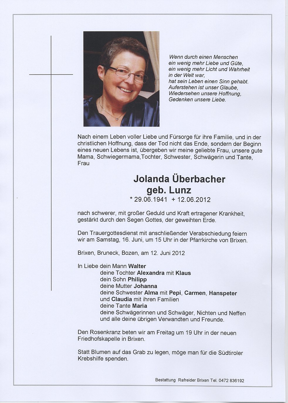 Nach einem Leben voller Liebe und Fürsorge für ihre Familie, und in der christlichen Hoffnung, dass der Tod nicht das Ende, sondern der Beginn eines neuen Lebens ist, übergeben wir meine geliebte Frau, unsere gute Mama, Schwiegermama,Tochter, Schwester, Schwägerin und Tante, Frau