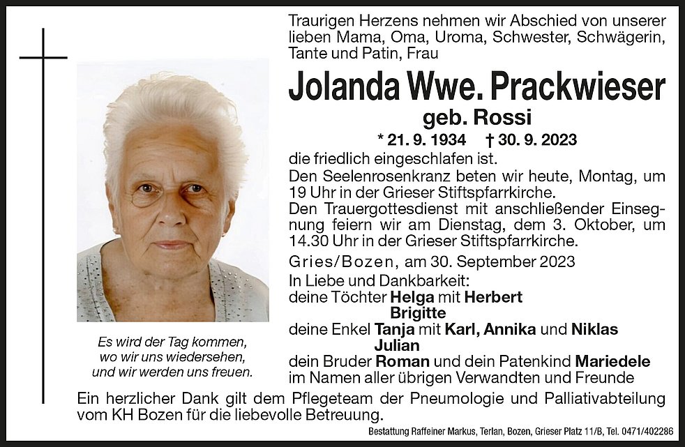 Den Trauergottesdienst mit anschließender Einsegnung feiern wir am Dienstag, dem 3. Oktober, um 14.30 Uhr in der Grieser Stiftspfarrkirche.
