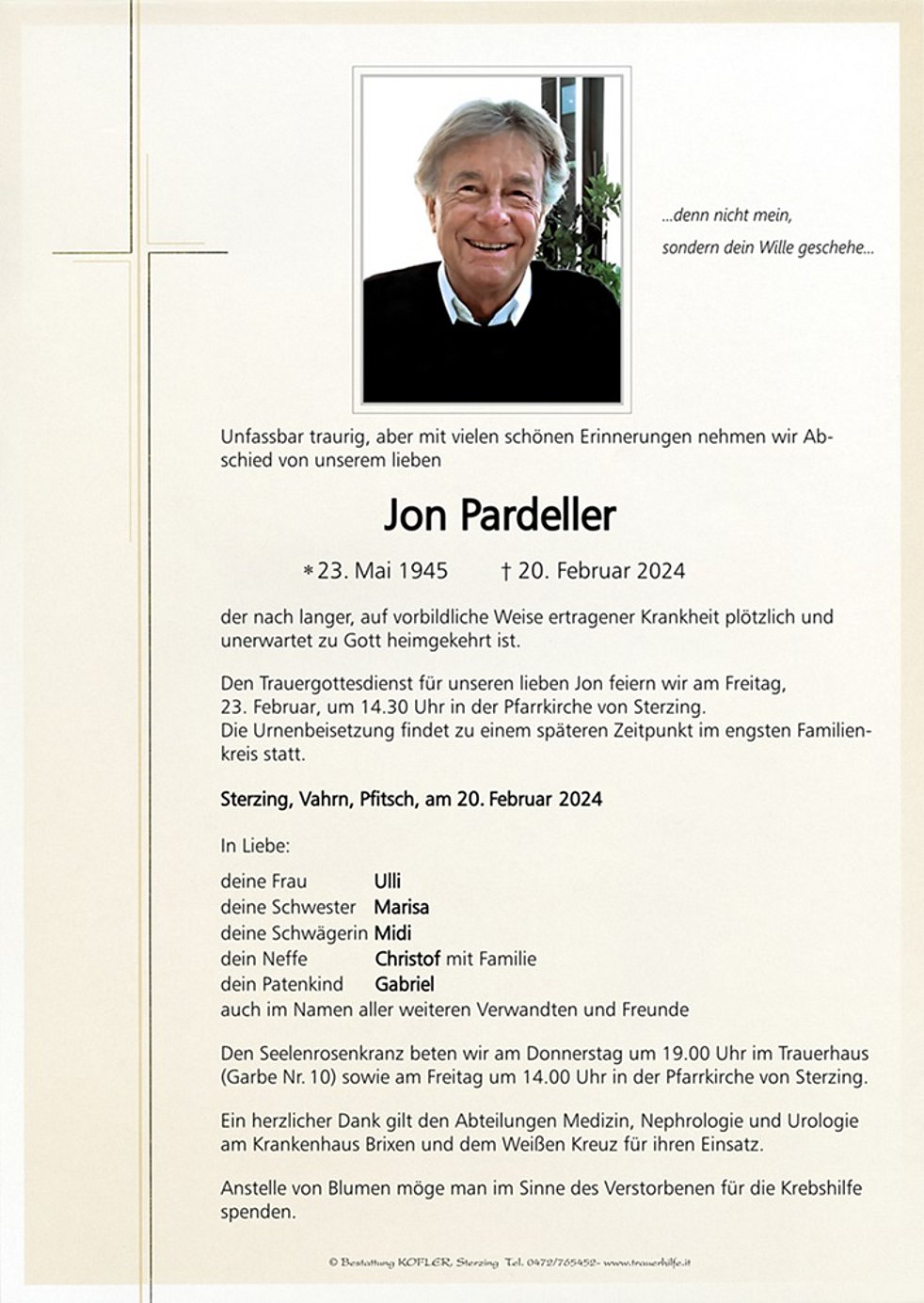 Den Trauergottesdienst für unseren lieben Jon feiern wir am Freitag, 23. Februar, um 14.30 Uhr in der Pfarrkirche von Sterzing. Die Urnenbeisetzung findet zu einem späteren Zeitpunkt im engsten Familienkreis statt.