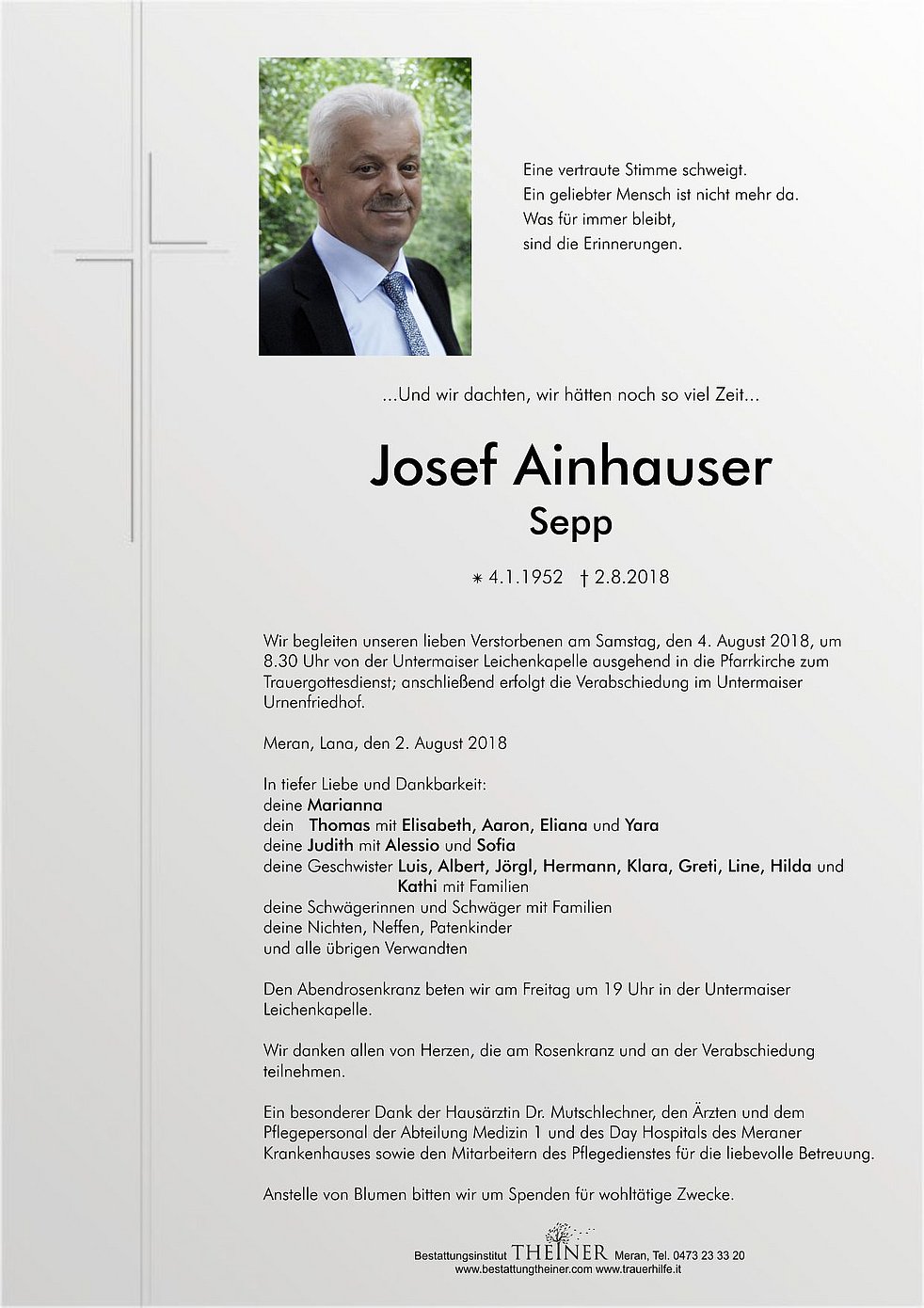 Wir begleiten unseren lieben Verstorbenen am Samstag, den 4. August 2018, um 8.30 Uhr von der Untermaiser Leichenkapelle ausgehend in die Pfarrkirche zum Trauergottesdienst; anschließend erfolgt die Verabschiedung im Untermaiser Urnenfriedhof.