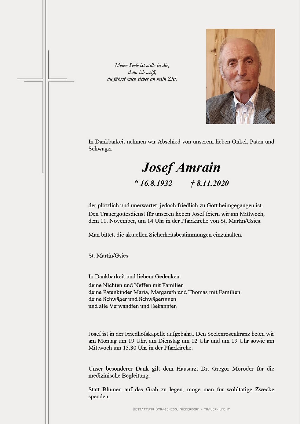 Den Trauergottesdienst für unseren lieben Josef feiern wir am Mittwoch, dem 11. November, um 14 Uhr in der Pfarrkirche von St. Martin/Gsies.