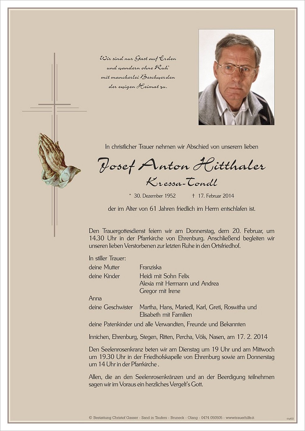 Allen, die an den Seelenrosenkränzen und an der Beerdigung teilnehmen sagen wir im Voraus ein herzliches Vergelt’s Gott.