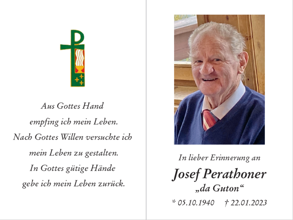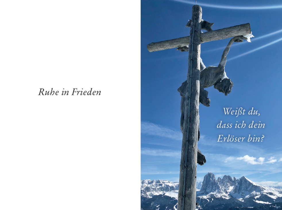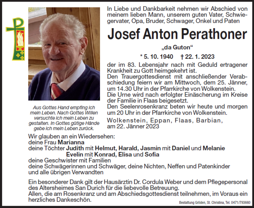 Den Trauergottesdienst mit anschließender Verabschiedung feiern wir am Mittwoch, dem 25. Jänner, um 14.30 Uhr in der Pfarrkirche von Wolkenstein.