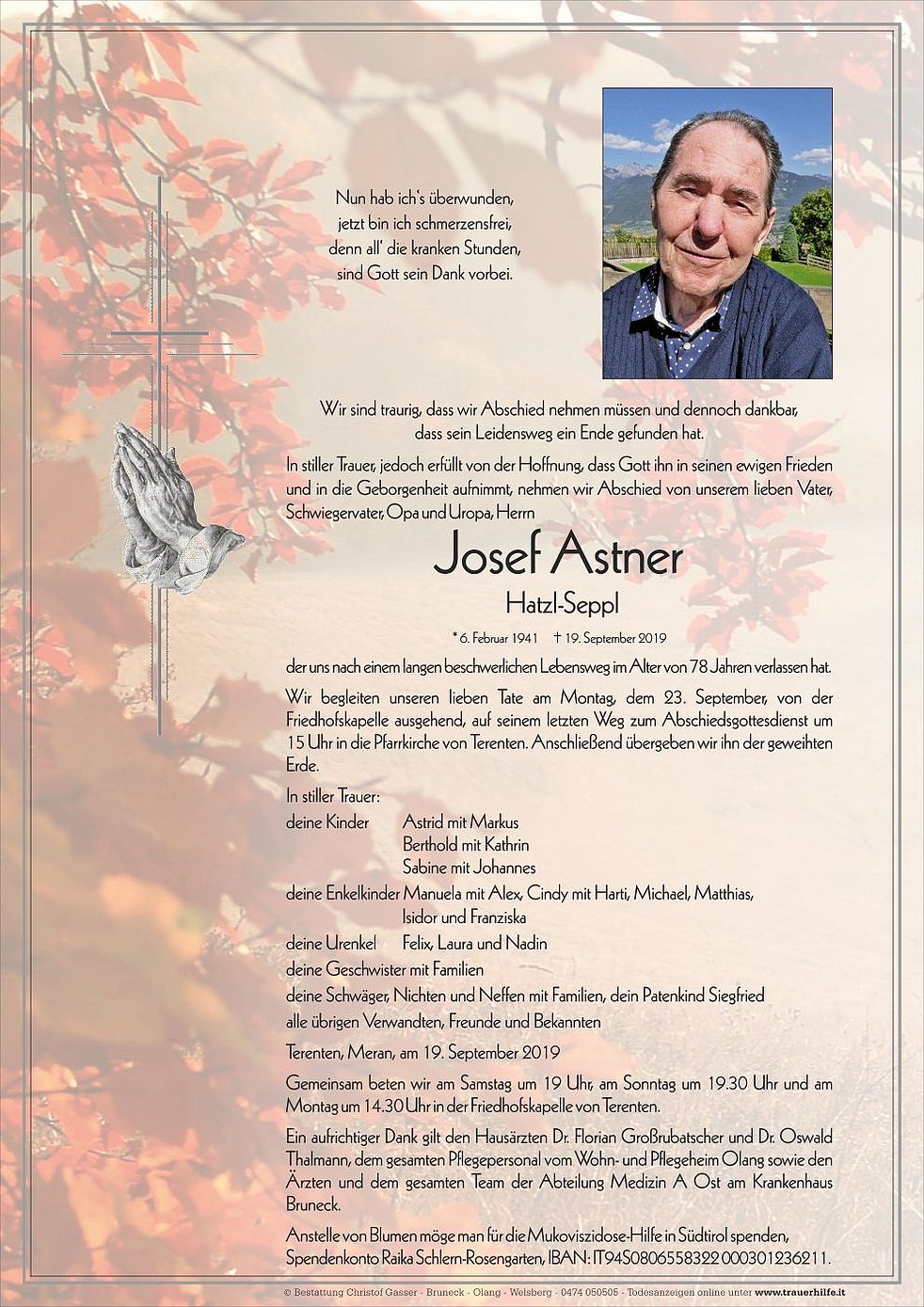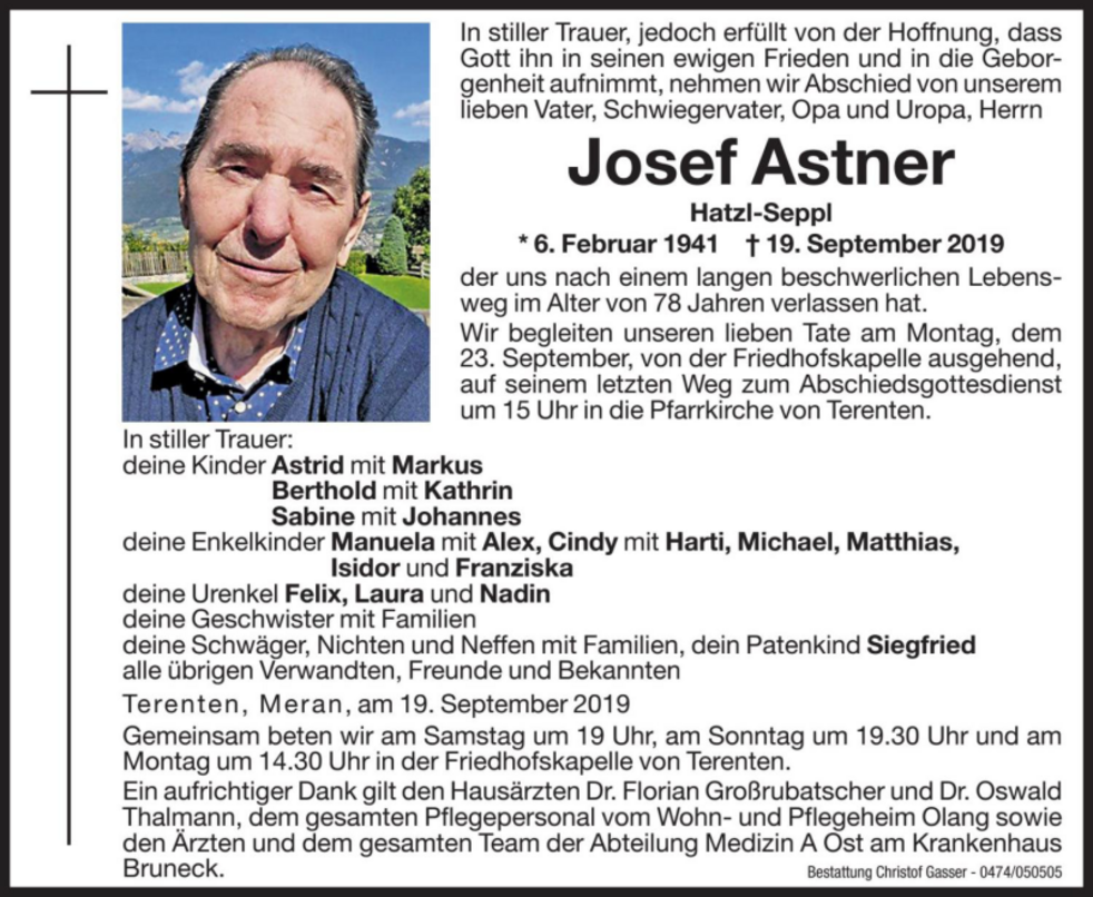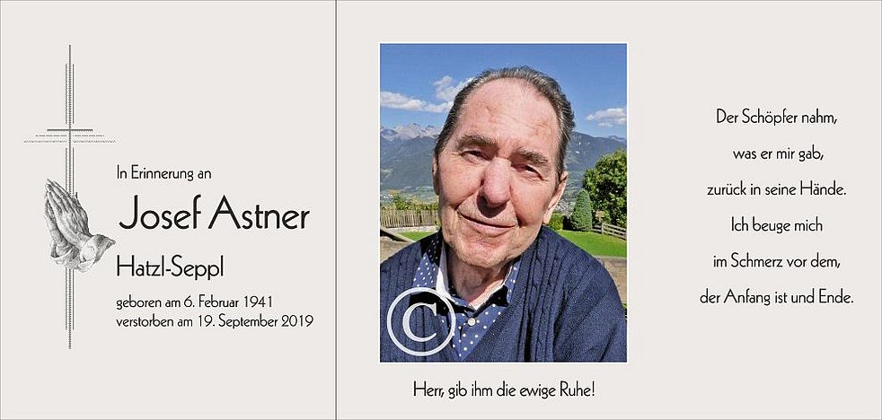 Wir begleiten unseren lieben Tate am Montag, dem 23. September, von der Friedhofskapelle ausgehend, auf seinem letzten Weg zum Abschiedsgottesdienst um 15 Uhr in die Pfarrkirche von Terenten. Anschließend übergeben wir ihn der geweihten Erde.