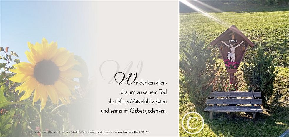 Anstelle von Blumen möge man für die Mukoviszidose-Hilfe in Südtirol spenden,Spendenkonto Raika Schlern-Rosengarten, IBAN: IT94S0806558322 000301236211.