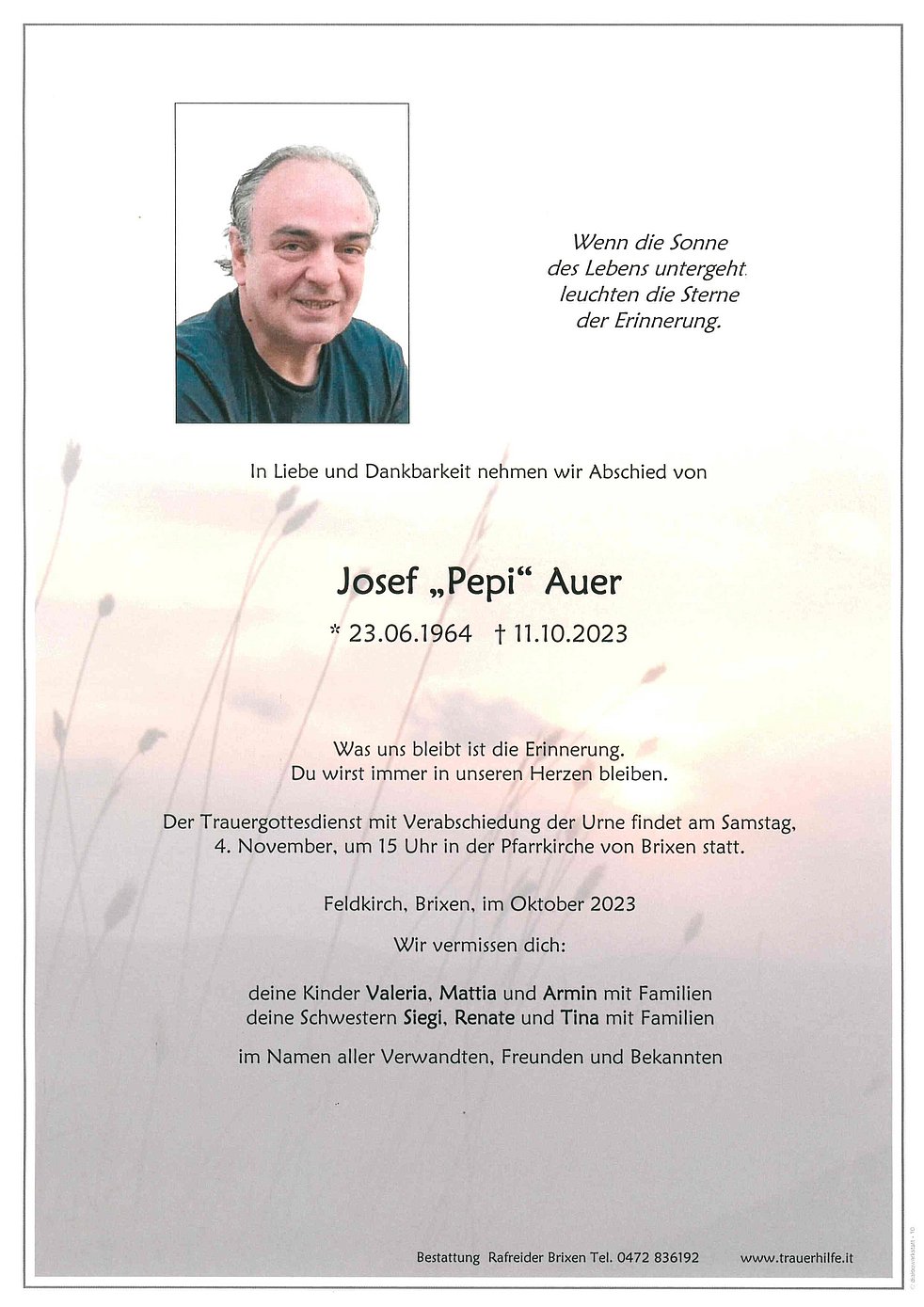 Trauerfeier: 04.11. - 15:00 Uhr Pfarrkirche Brixen