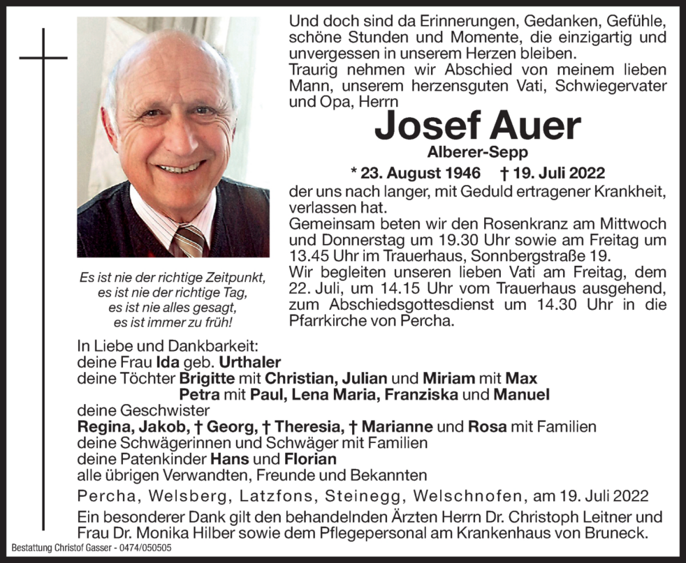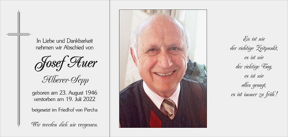 Wir begleiten unseren lieben Vati am Freitag, dem 22. Juli, um 14.15 Uhr vom Trauerhaus ausgehend, zum Abschiedsgottesdienst um 14.30 Uhr in die Pfarrkirche von Percha.