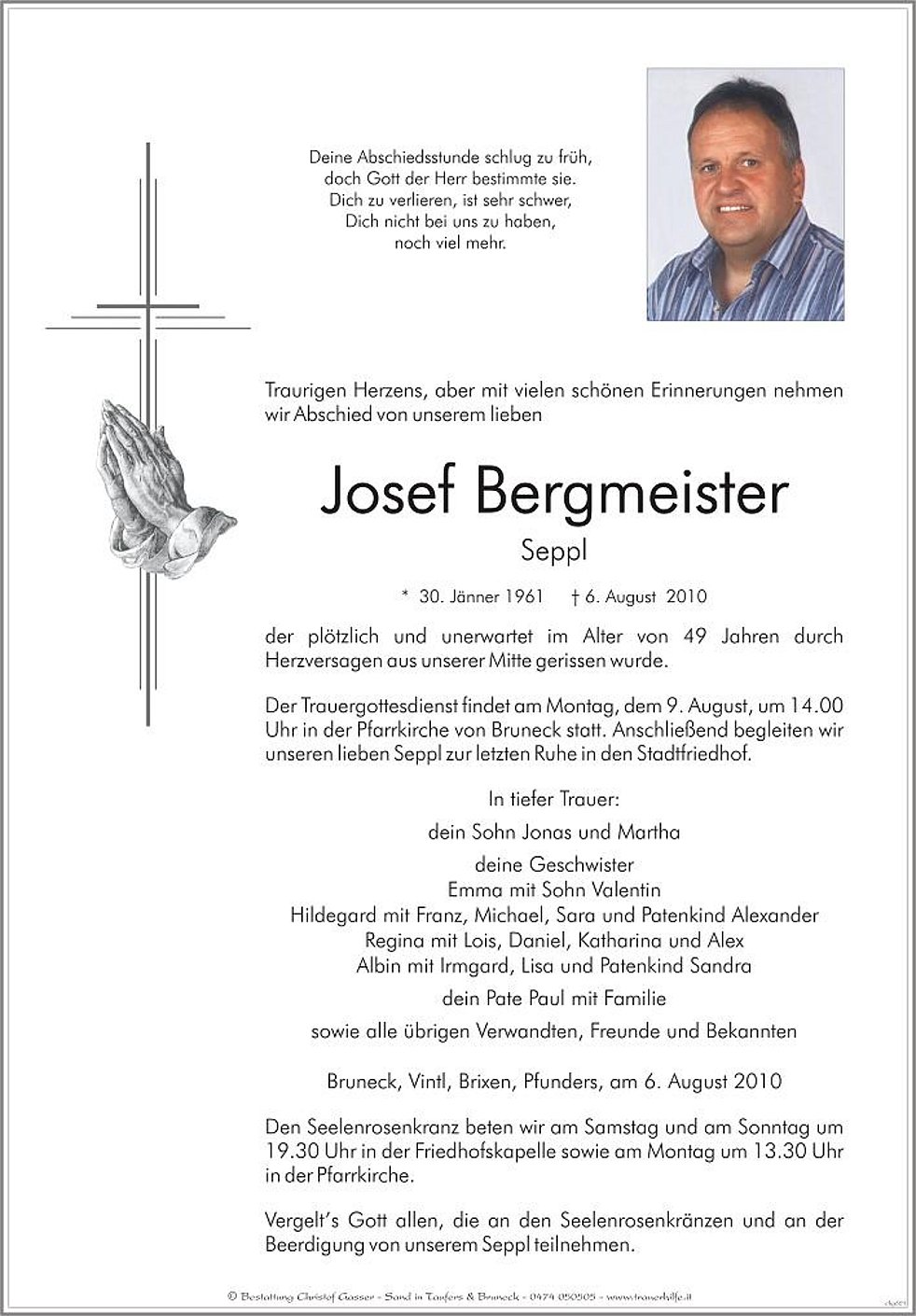 Der Trauergottesdienst findet am Montag, dem 9. August, um 14.00 Uhr in der Pfarrkirche von Bruneck statt. Anschließend begleiten wir unseren lieben Seppl zur letzten Ruhe in den Stadtfriedhof.