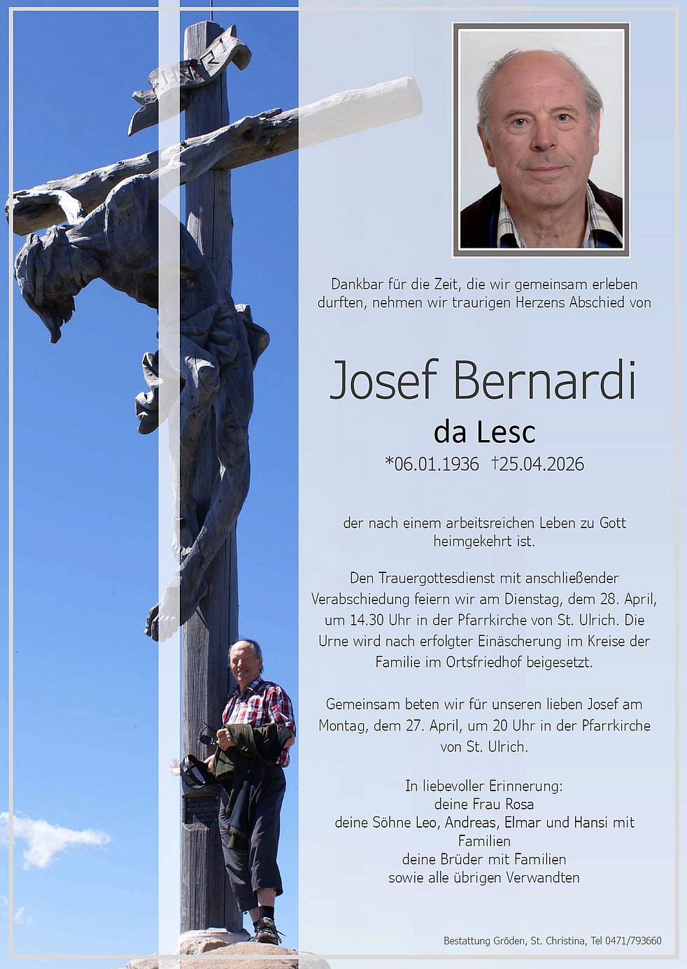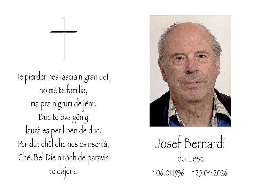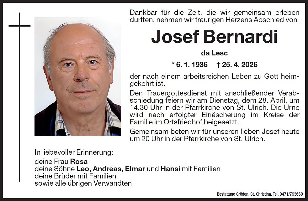 Den Trauergottesdienst mit anschließender Verabschiedung feiern wir am Dienstag, dem 28. April, um 14.30 Uhr in der Pfarrkirche von St. Ulrich. Die Urne wird nach erfolgter Einäscherung im Kreise der Familie im Ortsfriedhof beigesetzt.