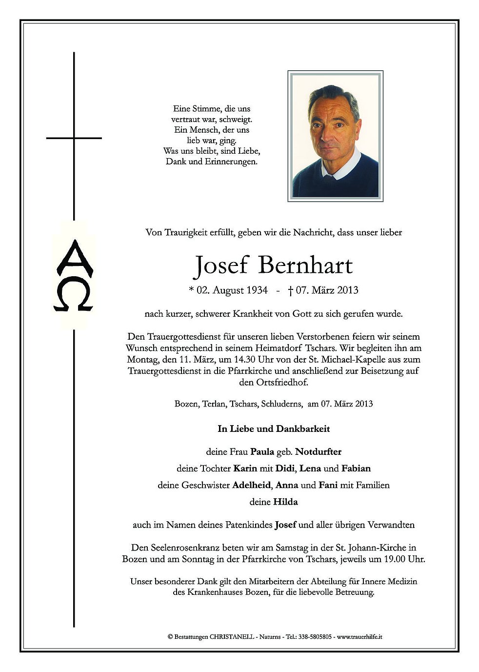 Den Trauergottesdienst für unseren lieben Verstorbenen feiern wir seinem Wunsch entsprechend in seinem Heimatdorf Tschars. Wir begleiten ihn am Montag, den 11. März, um 14.30 Uhr von der St. Michael-Kapelle aus zum Trauergottesdienst in die Pfarrkirche und anschließend zur Beisetzung auf den Ortsfriedhof.