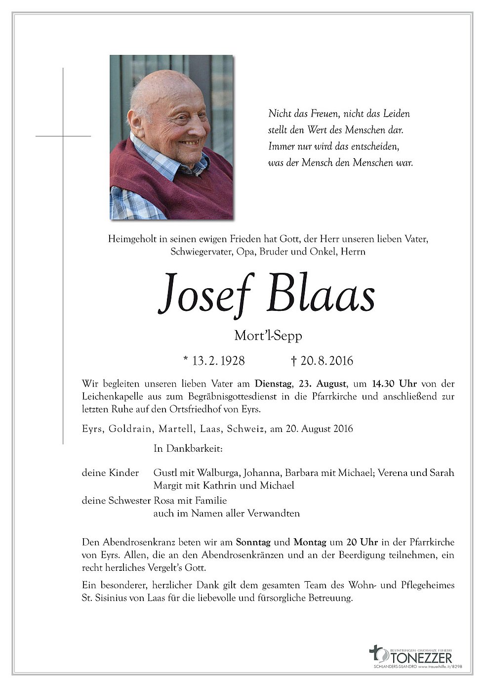 Wir begleiten unseren lieben Vater am Dienstag, 23. August, um 14.30 Uhr von der Leichenkapelle aus zum Begräbnisgottesdienst in die Pfarrkirche und anschließend zur letzten Ruhe auf den Ortsfriedhof von Eyrs.