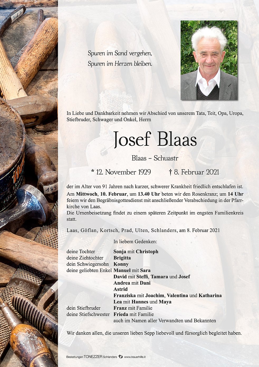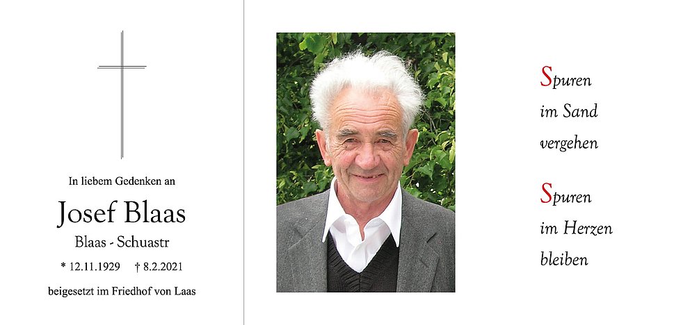 Am Mittwoch, 10. Februar, um 13.40 Uhr beten wir den Rosenkranz; um 14 Uhr feiern wir den Begräbnisgottesdienst mit anschließender Verabschiedung in der Pfarrkirche von Laas.