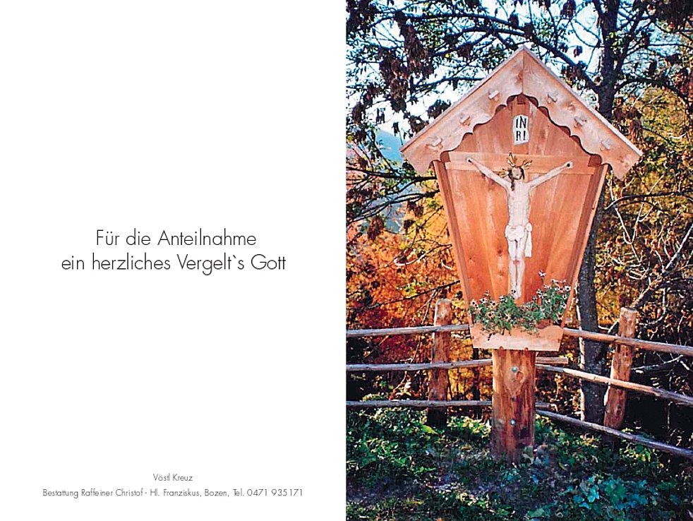 Wir begleiten unseren lieben Verstorbenen am Montag, dem 4. November um 14.30 Uhr zum Trauergottesdienst mit anschließender Einsegnung in die Pfarrkirche Maria in der Au in Bozen.