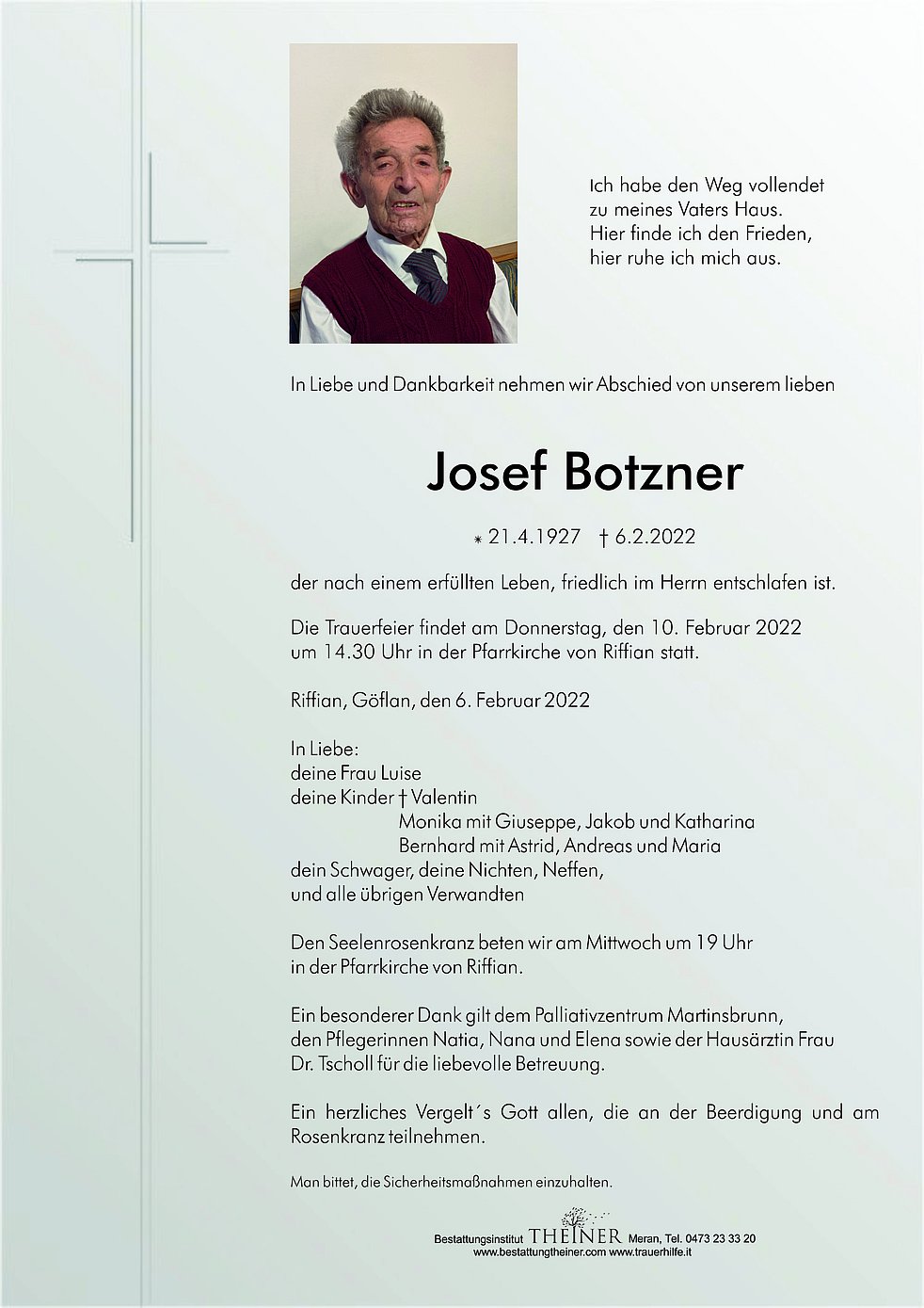 Die Trauerfeier findet am Donnerstag, den 10. Februar 2022 um 14.30 Uhr in der Pfarrkirche von Riffian statt.