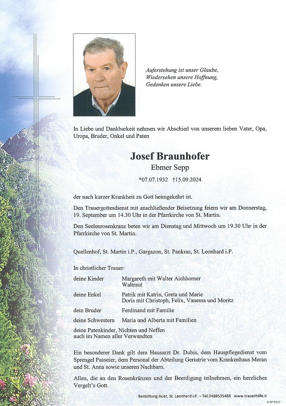 Ein besonderer Dank gilt dem Hausarzt Dr. Dubis, dem Hauspflegedienst vom Sprengel Passeier, dem Personal der Abteilung Geriatrie vom Krankenhaus Meran und St. Anna sowie unseren Nachbarn.
