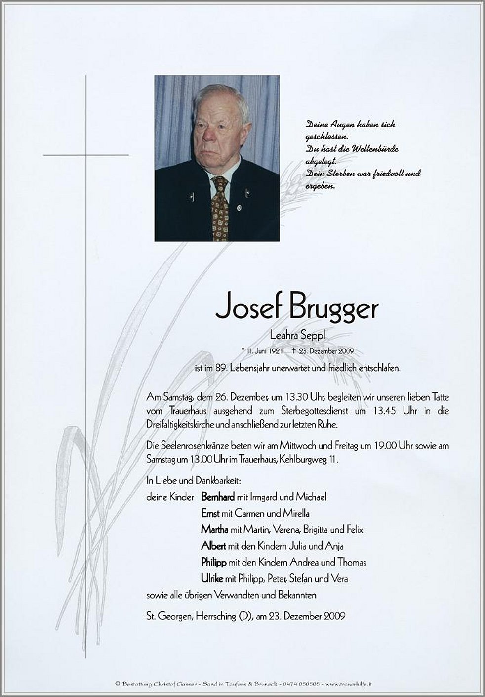 Am Samstag, dem 26. Dezember, um 13.30 Uhr, begleiten wir unseren lieben Tatte vom Trauerhaus ausgehend zum Sterbegottesdienst um 13.45 Uhr in die Dreifaltigkeitskirche und anschließend zur letzten Ruhe.