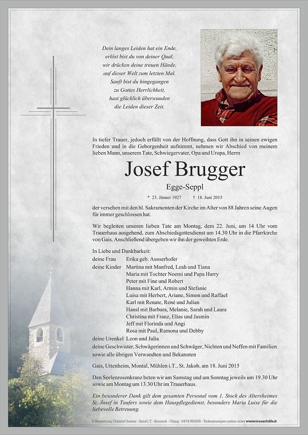 Wir begleiten unseren lieben Tate am Montag, dem 22. Juni, um 14 Uhr vom Trauerhaus ausgehend, zum Abschiedsgottesdienst um 14.30 Uhr in die Pfarrkirche von Gais. Anschließend übergeben wir ihn der geweihten Erde.