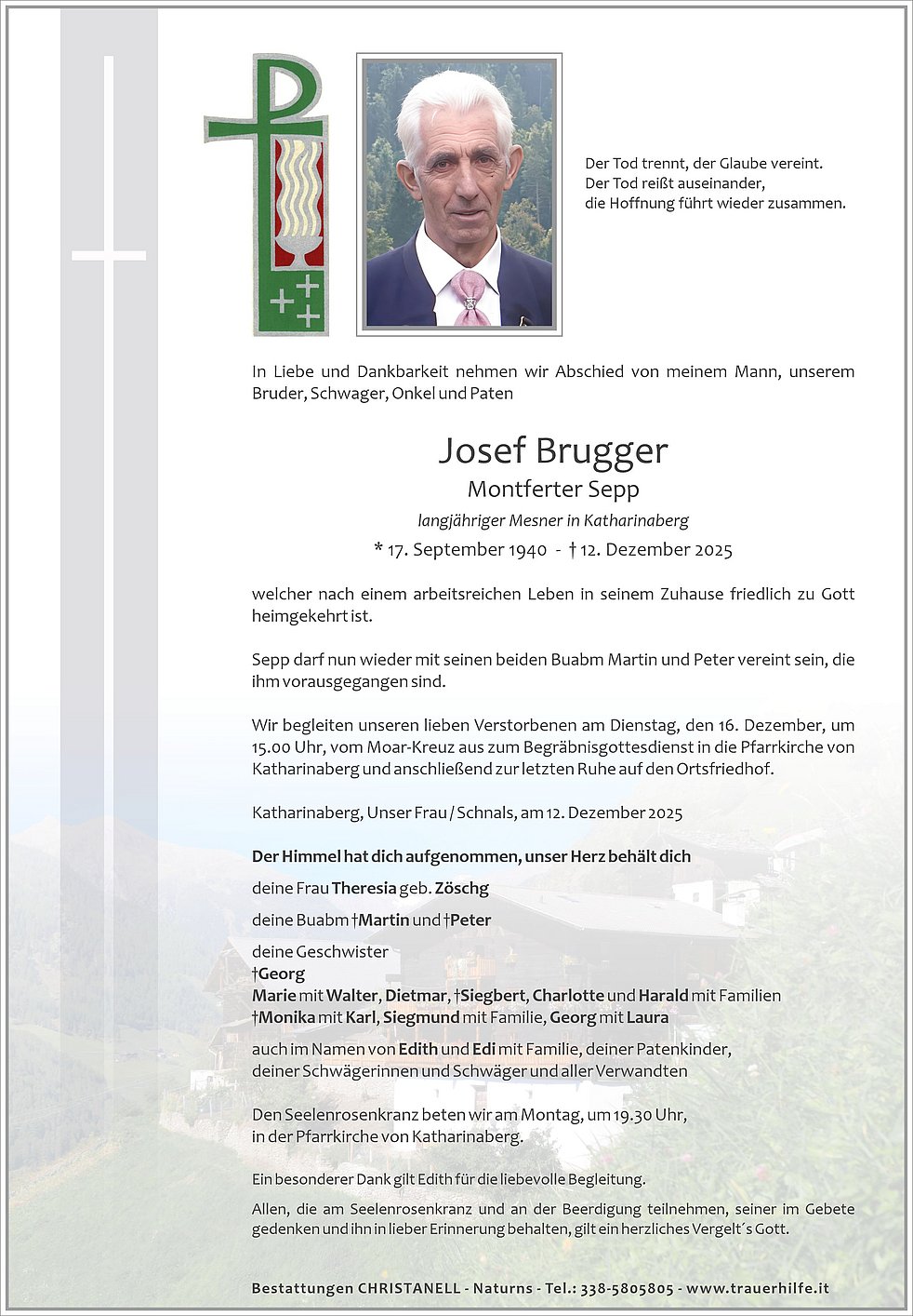 Wir begleiten unseren lieben Verstorbenen am Dienstag, den 16. Dezember, um 15.00 Uhr, vom Moar-Kreuz aus zum Begräbnisgottesdienst in die Pfarrkirche von Katharinaberg und anschließend zur letzten Ruhe auf den Ortsfriedhof.