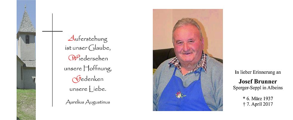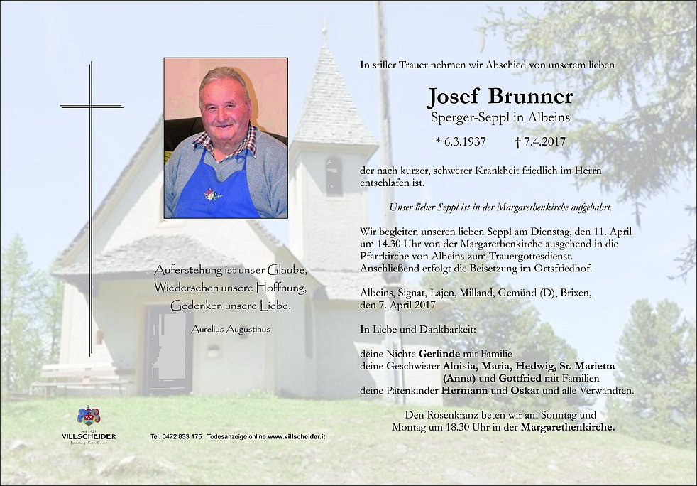Wir begleiten unseren lieben Seppl am Dienstag, den 11. April um 14.30 Uhr von der Margarethenkirche ausgehend in die Pfarrkirche von Albeins zum Trauergottesdienst.