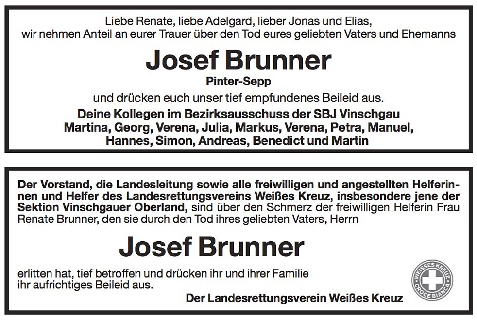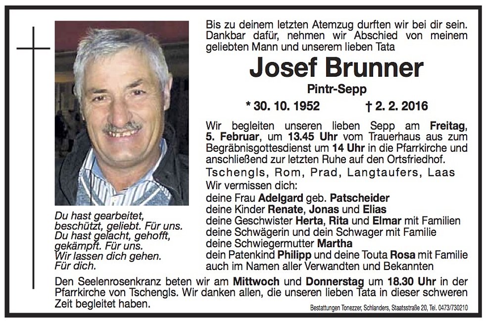 Den Seelenrosenkranz beten wir am Mittwoch und Donnerstag um 18.30 Uhr in der Pfarrkirche von Tschengls. Wir danken allen, die unseren lieben Tata in dieser schweren Zeit begleitet haben, sowie an den Seelenrosenkränzen und an der Beerdigung teilnehmen.