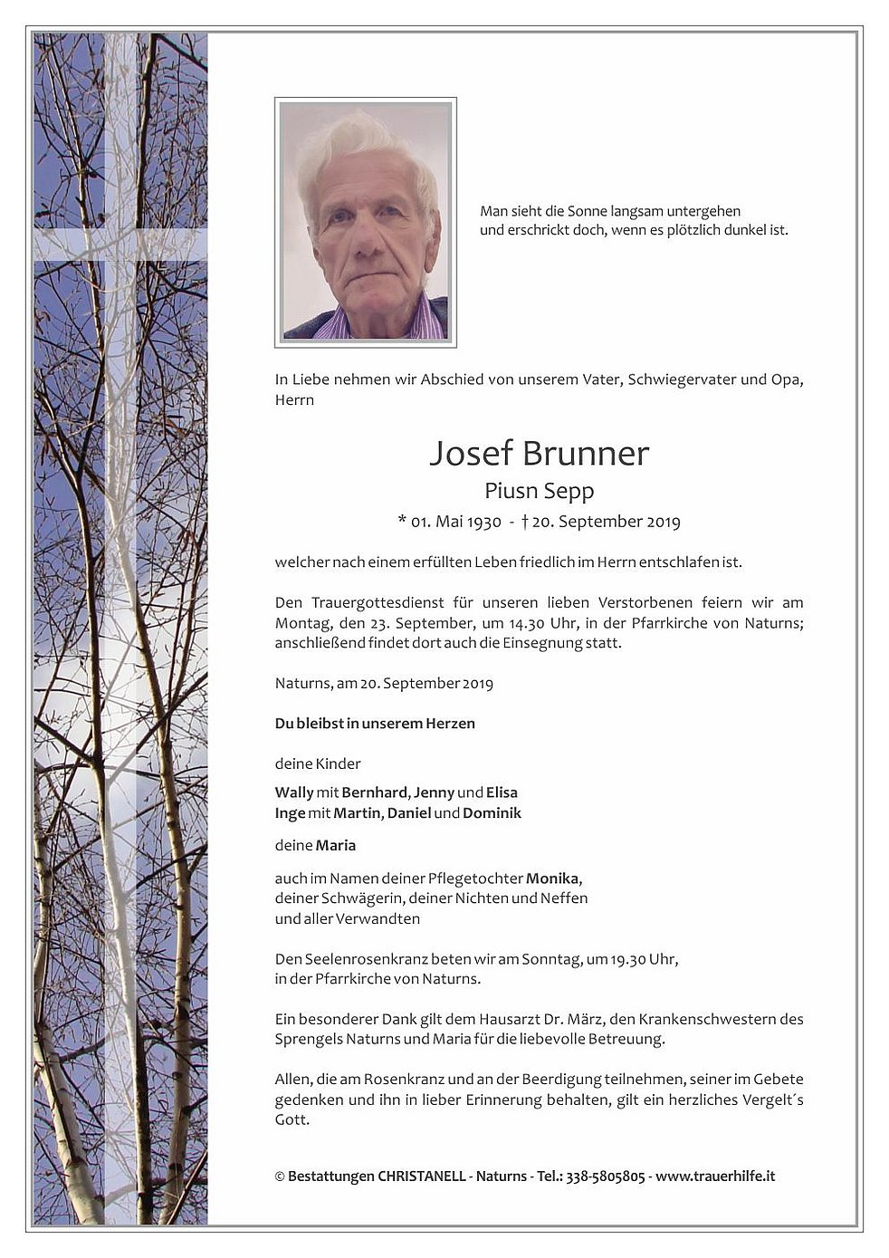 Den Trauergottesdienst für unseren lieben Verstorbenen feiern wir am Montag, den 23. September, um 14.30 Uhr, in der Pfarrkirche von Naturns; anschließend findet dort auch die Einsegnung statt.