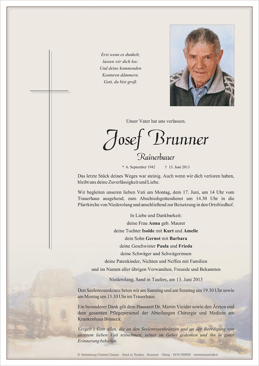 Wir begleiten unseren lieben Vati am Montag, dem 17. Juni, um 14 Uhr vom Trauerhaus ausgehend, zum Abschiedsgottesdienst um 14.30 Uhr in die Pfarrkirche von Niederolang und anschließend zur Beisetzung in den Ortsfriedhof.