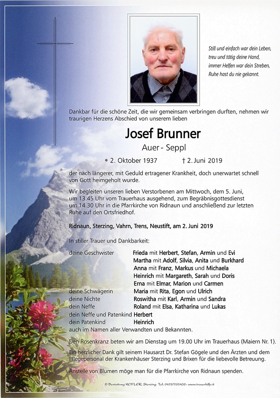 Wir begleiten unseren lieben Verstorbenen am Mittwoch, dem 5. Juni, um 13.45 Uhr vom Trauerhaus ausgehend, zum Begräbnisgottesdienst um 14.30 Uhr in die Pfarrkirche von Ridnaun und anschließend zur letzten Ruhe auf den Ortsfriedhof.