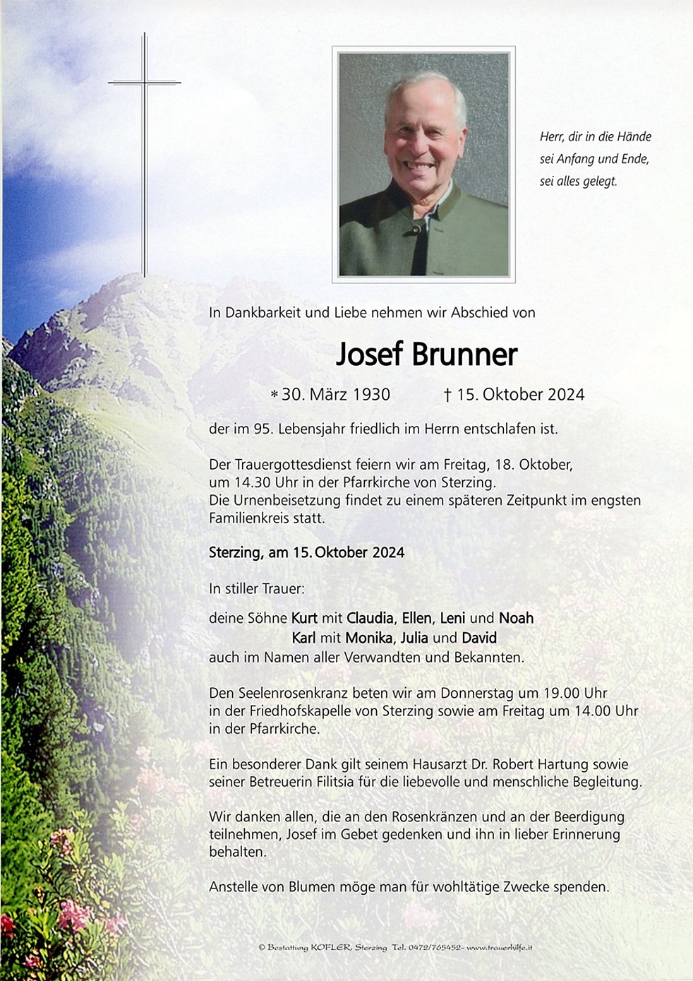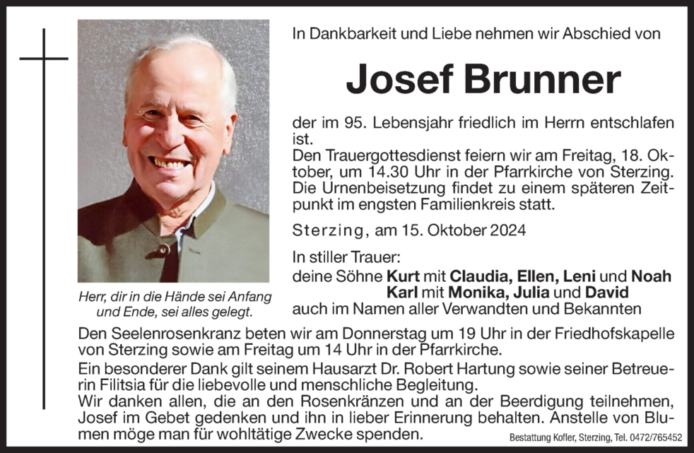 Der Trauergottesdienst feiern wir am Freitag, 18. Oktober, um 14.30 Uhr in der Pfarrkirche von Sterzing. Die Urnenbeisetzung findet zu einem späteren Zeitpunkt im engsten Familienkreis statt.