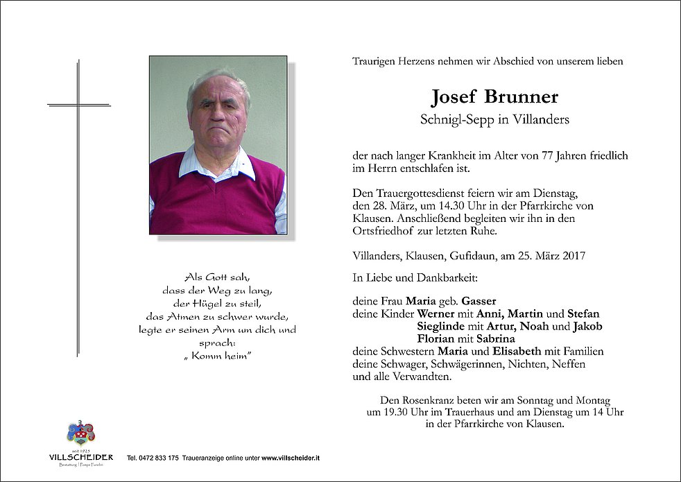 den 28. März, um 14.30 Uhr in der Pfarrkirche von Klausen. Anschließend begleiten wir ihn in den Ortsfriedhof zur letzten Ruhe.