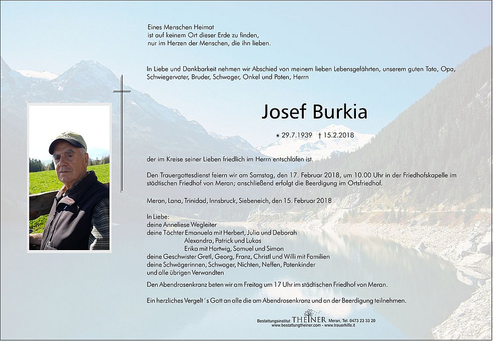 Den Trauergottesdienst feiern wir am Samstag, den 17. Februar 2018, um 10.00 Uhr in der Friedhofskapelle im städtischen Friedhof von Meran; anschließend erfolgt die Beerdigung im Ortsfriedhof.