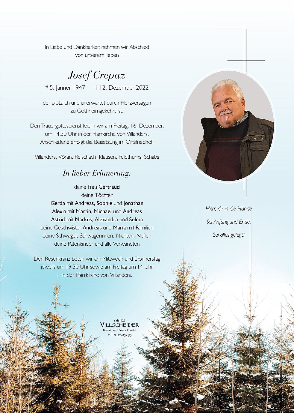 Die Gedanken der Erinnerung, sind eine Brücke über das Leben hinaus. Liebe Trauerfamilie,unser tiefes Mitgefühl zum Tod Eures lieben Mannes und Vaters. Jahrgang 1947 Feldthurns