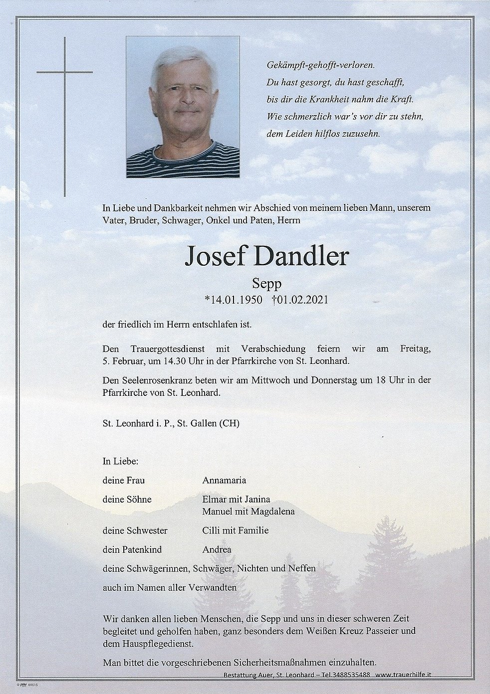 Den Trauergottesdienst mit Verabschiedung feiern wir am Freitag, 5. Februar, um 14.30 Uhr in der Pfarrkirche von St. Leonhard.