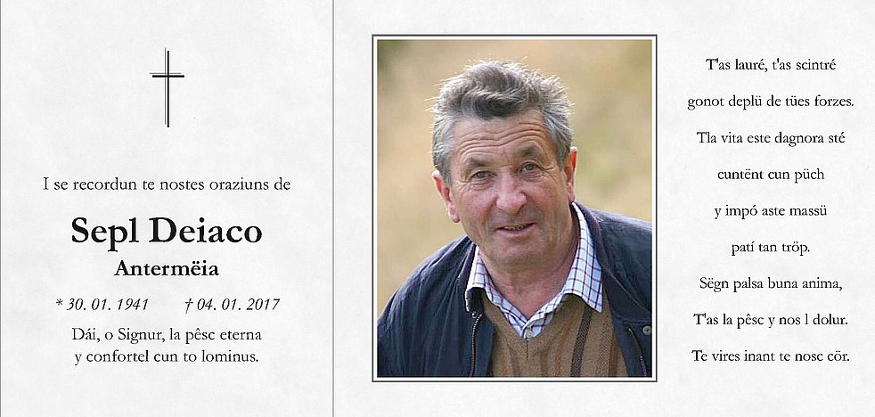 Ein besonderer Dank gebührt dem Hausarzt Dr. Aldo Marcocci, unserem Pfarrer Herrn Paul Campei und den Krankenschwestern und Pflegerinnen des Sprengels Pikolein für die liebevolle Pflege, Betreuung und Zuwendung.