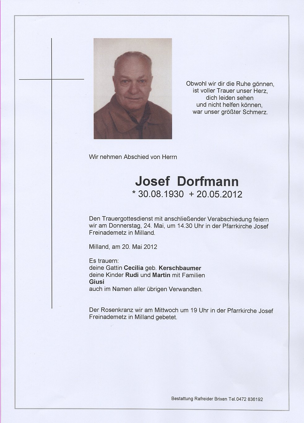 Den Trauergottesdienst mit anschließender Verabschiedung feiern wir am Donnerstag, 24. Mai, um 14.30 Uhr in der Pfarrkirche Josef Freinademetz in Milland.