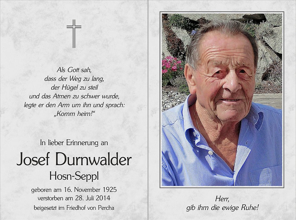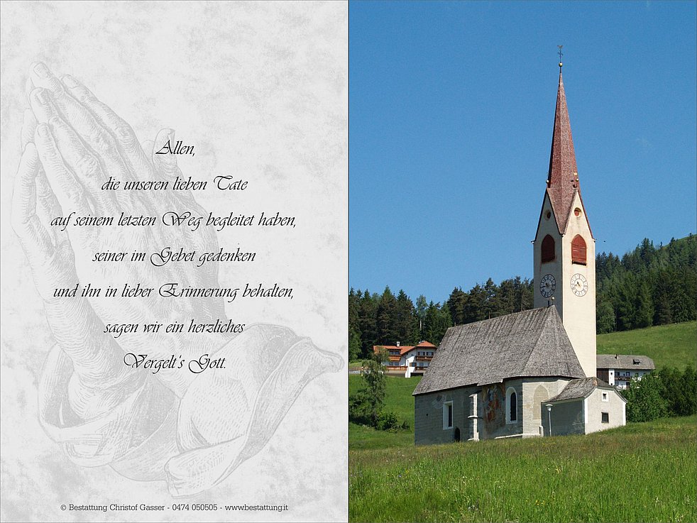 Den Seelenrosenkranz beten wir am Mittwoch und am Donnerstag um 19.30 Uhr sowie am Freitag um 13 Uhr im Trauerhaus. Ein besonderer Dank gilt der Hausärztin Dr. Astride Bonura sowie den Ärzten und dem gesamten Pflegepersonal der Abteilung Chirurgie am Krankenhaus Bruneck.