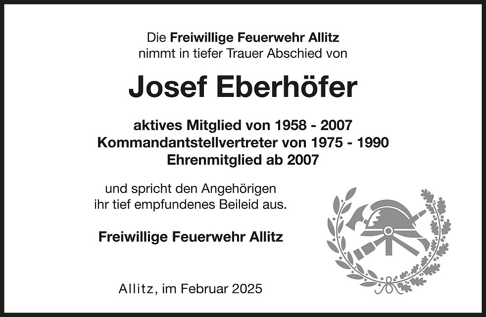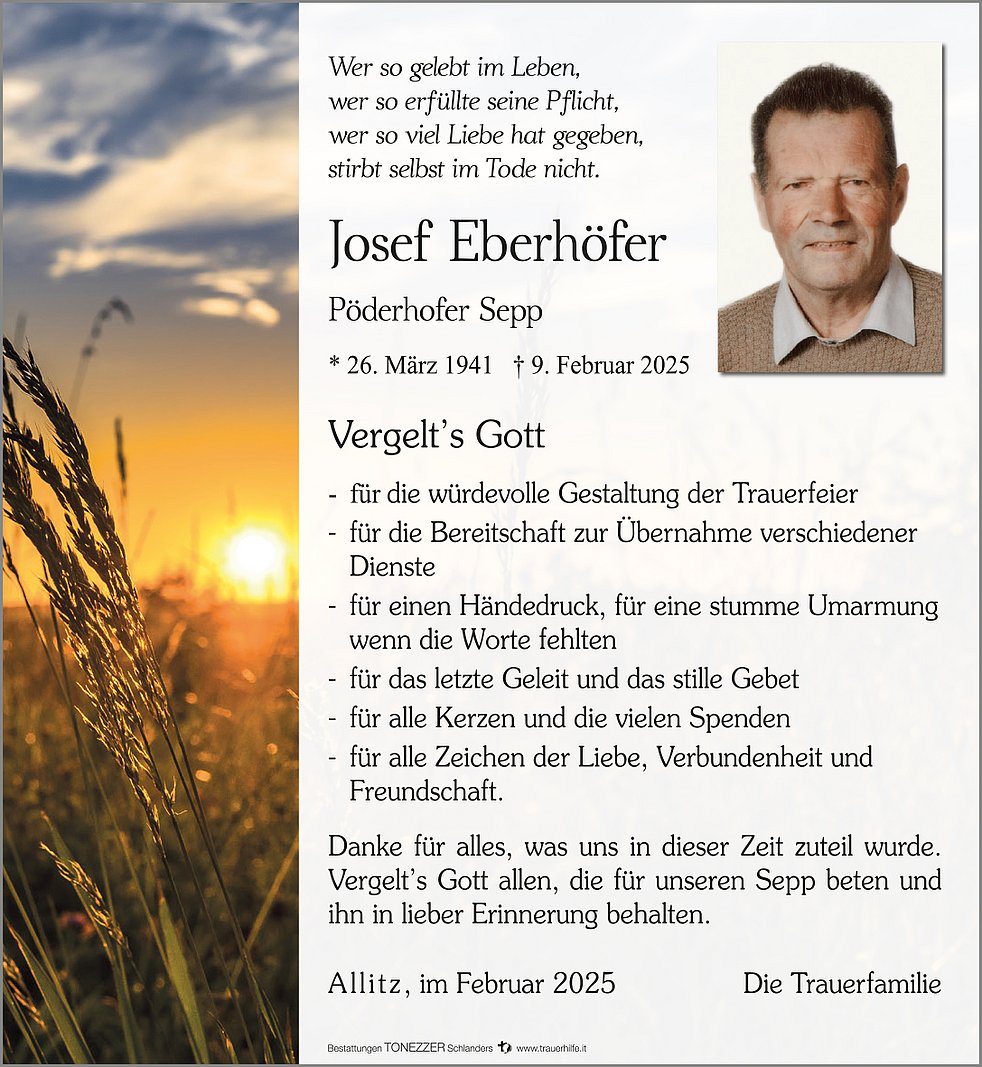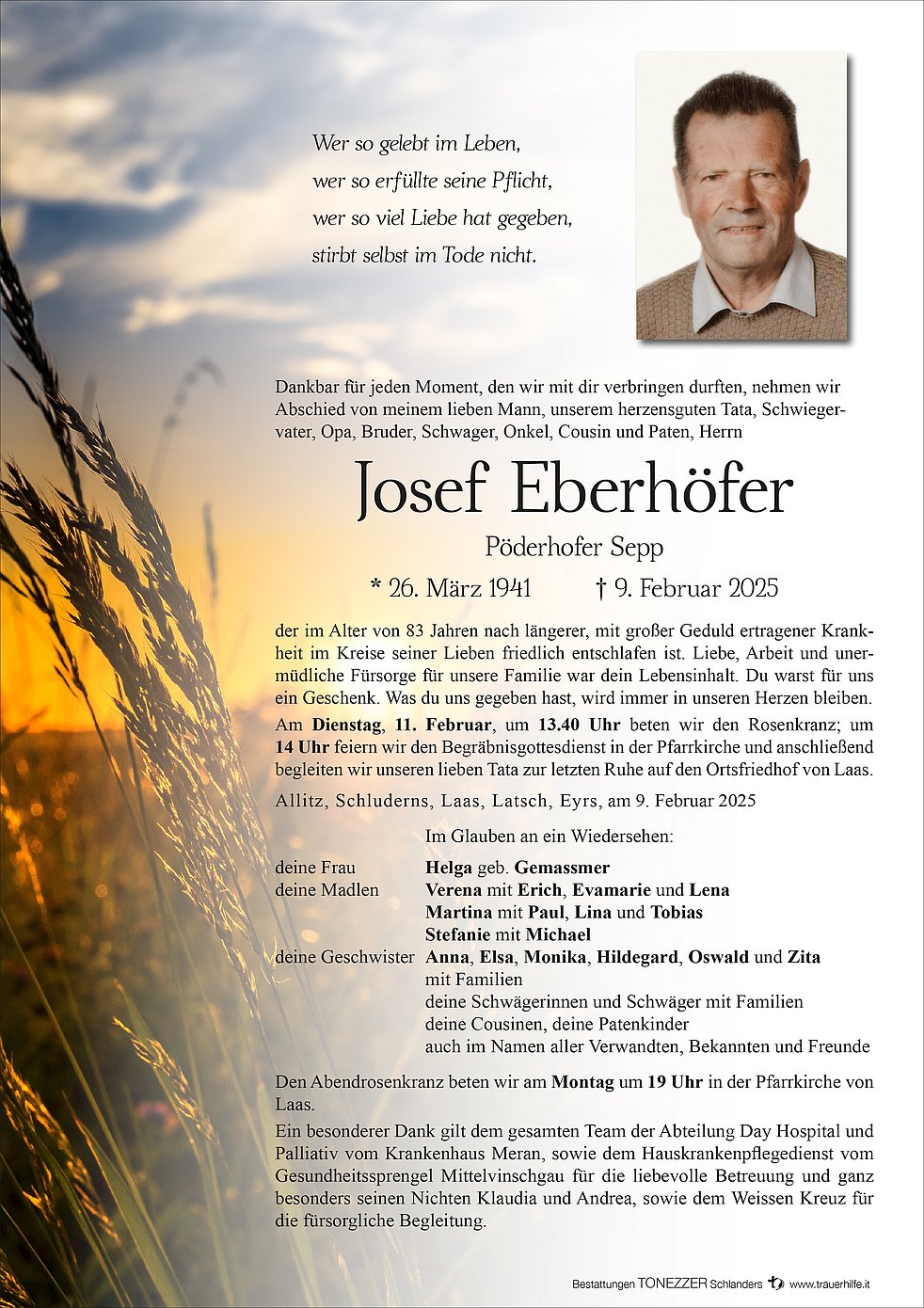 Am Dienstag, 11. Februar, um 13.40 Uhr beten wir den Rosenkranz; um 14 Uhr feiern wir den Begräbnisgottesdienst in der Pfarrkirche und anschließend begleiten wir unseren lieben Tata zur letzten Ruhe auf den Ortsfriedhof von Laas.