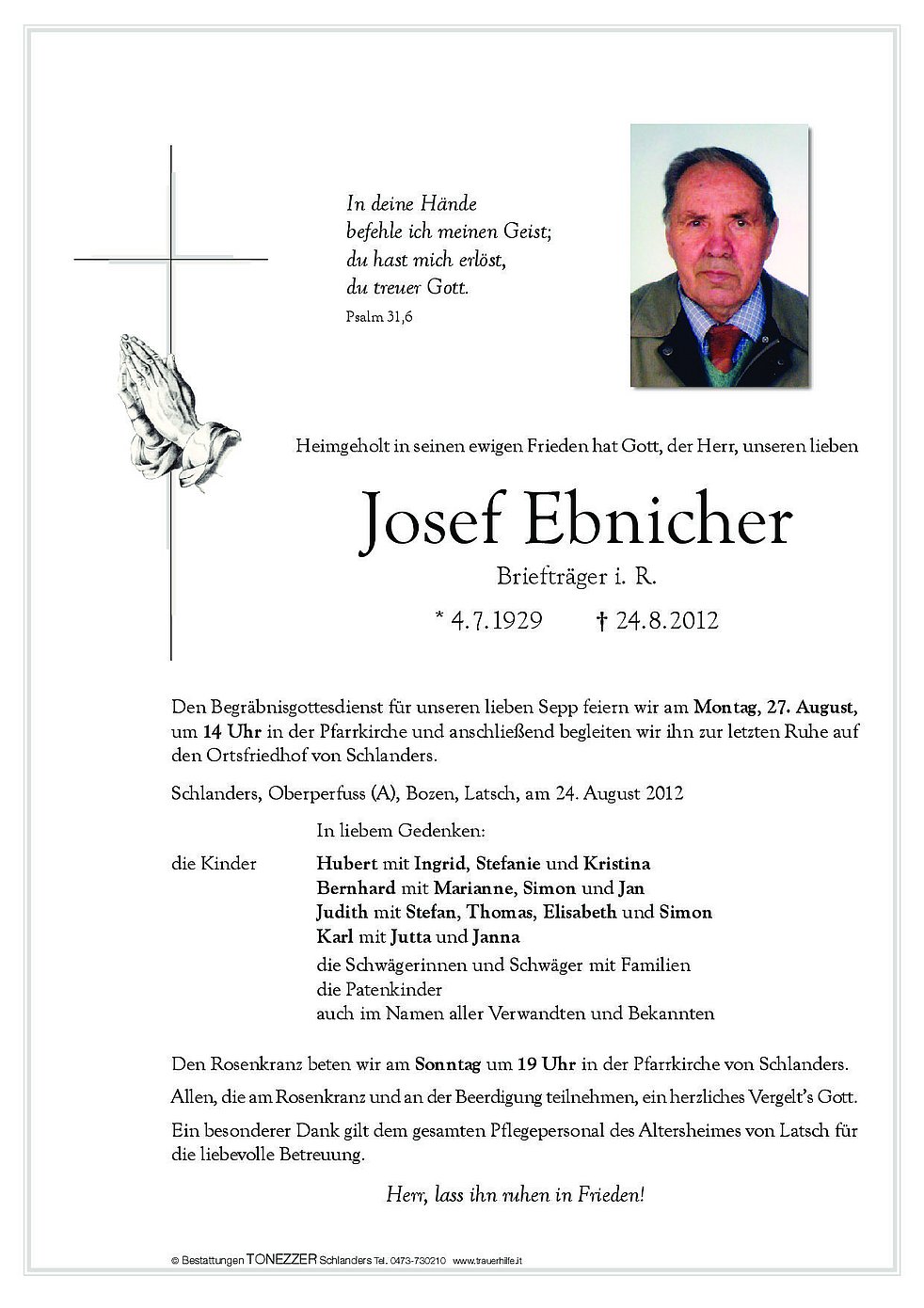 Den Begräbnisgottesdienst für unseren lieben Sepp feiern wir am Montag, 27. August, um 14 Uhr in der Pfarrkirche und anschließend begleiten wir ihn zur letzten Ruhe auf den Ortsfriedhof von Schlanders.