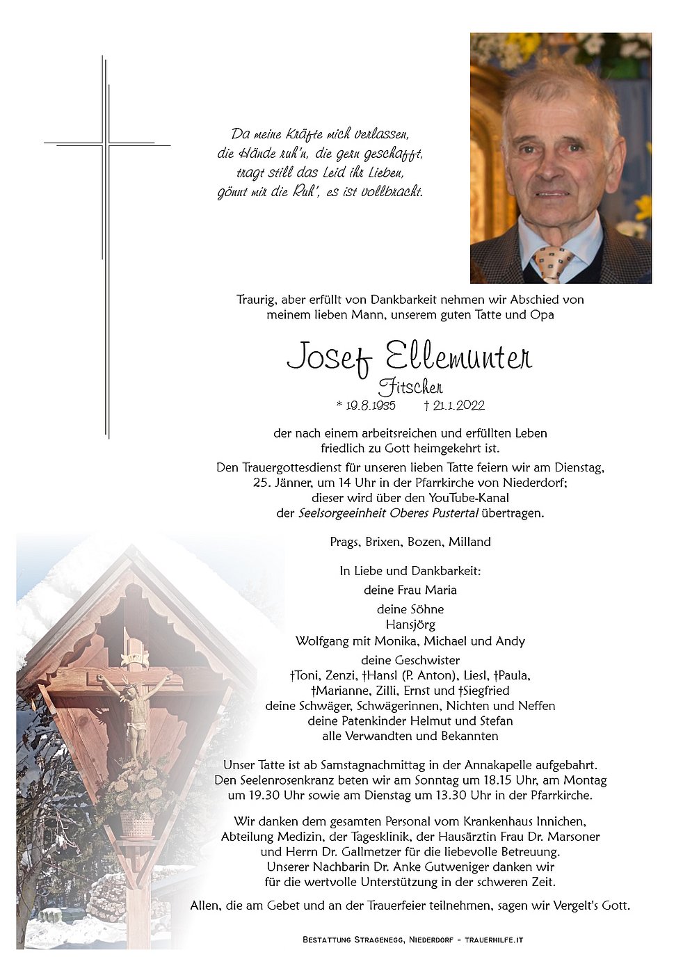 Den Trauergottesdienst für unseren lieben Tatte feiern wir am Dienstag, 25. Jänner, um 14 Uhr in der Pfarrkirche von Niederdorf; dieser wird über den YouTube-Kanal der Seelsorgeeinheit Oberes Pustertal übertragen.